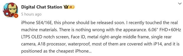 هدف از این کار همسانتر کردن نامگذاری پرچمداران اپل با یکدیگر عنوان شده بود. امروز اما افشاگر بزرگ و سرشناس حوزه گوشیهای موبایل، Digital Chat Station نیز تغییر نام این گوشی میانرده را تایید کرد. او علاوه بر این همچنین جزئیاتی را نیز در خصوص مشخصات فنی آیفون ۱۶E اپل منتشر کرد که در ادامه به بررسی بیشتر آن خواهیم پرداخت.