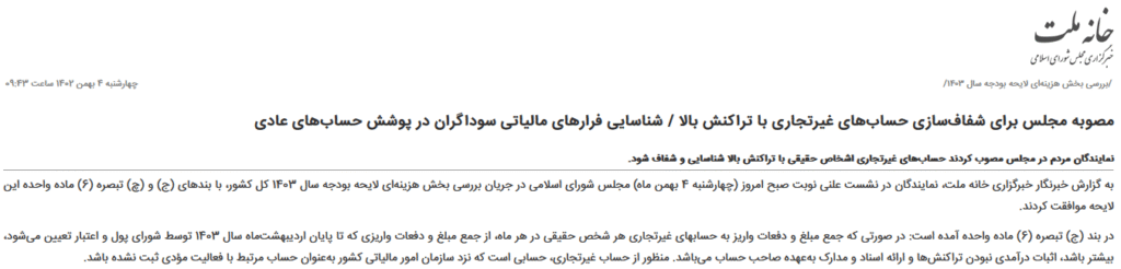 در بند (ج) تبصره (۶) لایحه بودجه ۱۴۰۳ آمده است: در صورتی که جمع مبلغ و دفعات واریز به حسابهای غیرتجاری هر شخص حقیقی در هر ماه، از جمع مبلغ و دفعات واریزی که تا پایان اردیبهشتماه سال ۱۴۰۳ توسط شورای پول و اعتبار تعیین میشود، بیشتر باشد، اثبات درآمدی نبودن تراکنشها و ارائه اسناد و مدارک بهعهده صاحب حساب میباشد. منظور از حساب غیرتجاری، حسابی است که نزد سازمان امور مالیاتی کشور بهعنوان حساب مرتبط با فعالیت مؤدی ثبت نشده باشد.