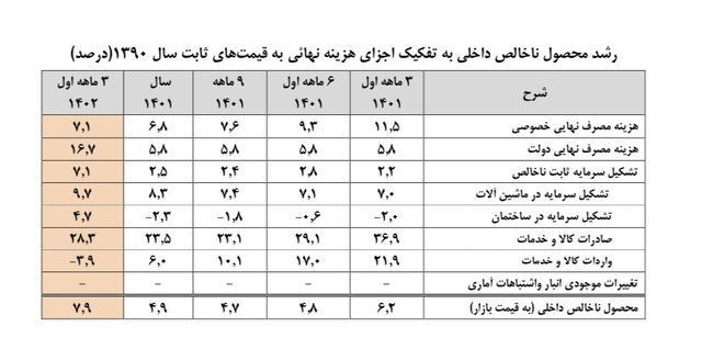 به گزارش اخبار ما، بر اساس آخرین نتایج حسابهای ملی فصلی مرکز آمار ایران، محصول ناخالص داخلی(GDP) به قیمت ثابت سال ١٣٩٠، در سه ماهه اول سال ١٤٠٢، به رقم ٢١٤٤ هزار میلیارد ریال با نفت و ١٨١٨ هزار میلیارد ریال بدون احتساب نفت رسیده است، در حالیکه رقم مذکور در فصل مشابه سال قبل با نفت ١٩٨٦ هزار میلیارد ریال و بدون نفت ١٧١٤ هزار میلیارد ریال بوده که نشان از رشد ٧,٩ درصدی محصول ناخالص داخلی با نفت و ٦.١ درصدی محصول ناخالص داخلی بدون نفت در فصل بهار سال ١٤٠٢ دارد.